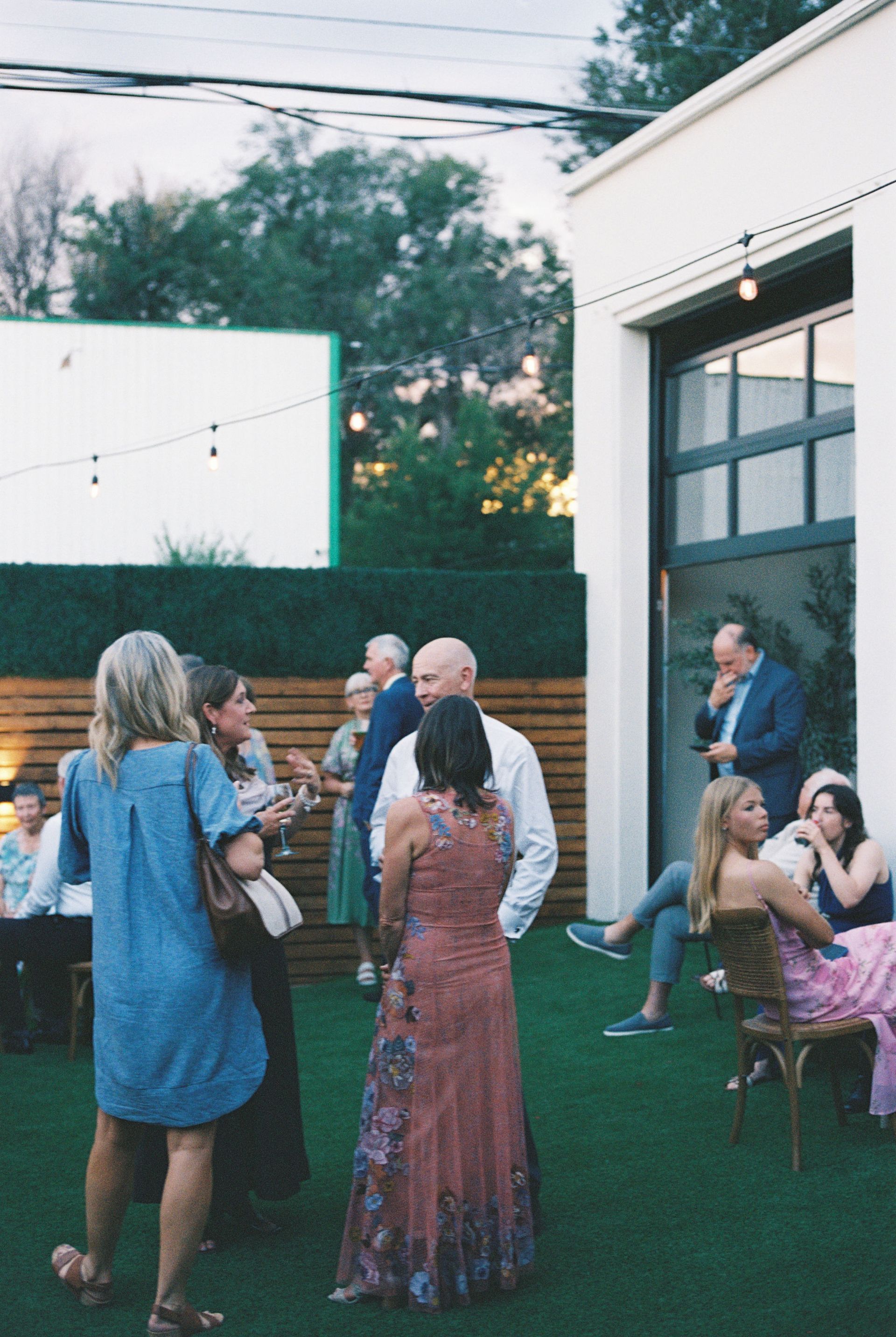 - An outdoor garden area draped in market lights