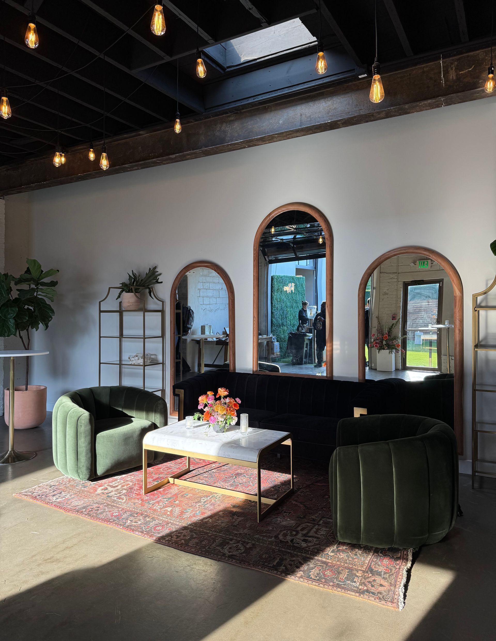 At Bestow, your event isn’t limited to one predictable space — it can flow, surprise, and unfold across four distinct spaces, each with its own personality. The Main Hall is a bright, airy showstopper with massive glass garage doors that bring the Colorado sunshine right inside. It’s the perfect blank canvas for everything from elegant, seated dinners to lively dance floors. A signature oversize white wall provides a backdrop for your creativity to soar with customizable backdrops for your event.